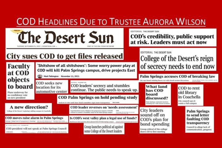 Three of five Board of Trustees stand in the way of more than 92,000 voters who approved Measure CC. Two of the three trustees are up for re-election including Incumbent Trustee Aurora Wilson. COD needs to build the educational facilities that were promised. Stop wasting time and millions in construction delays.